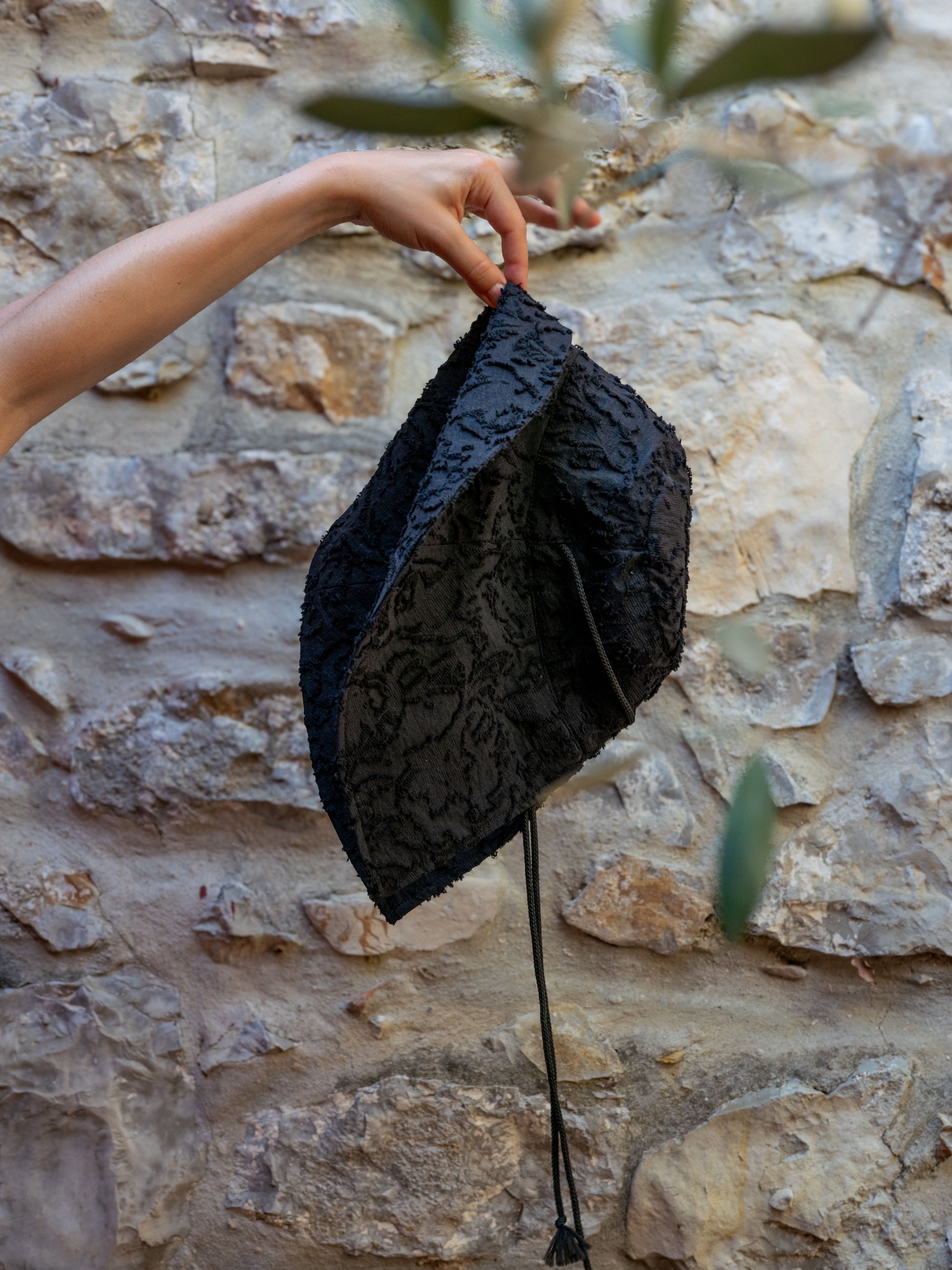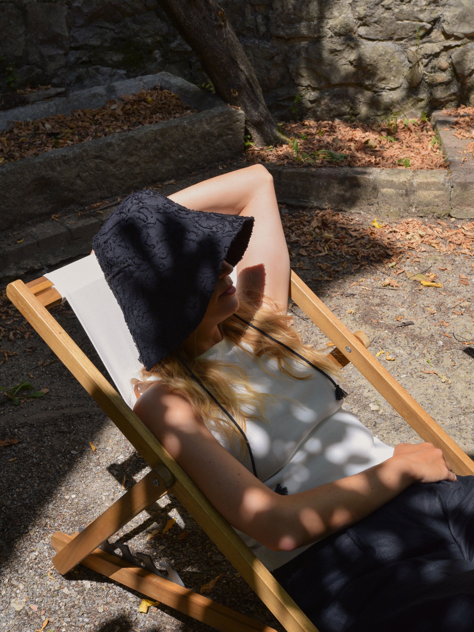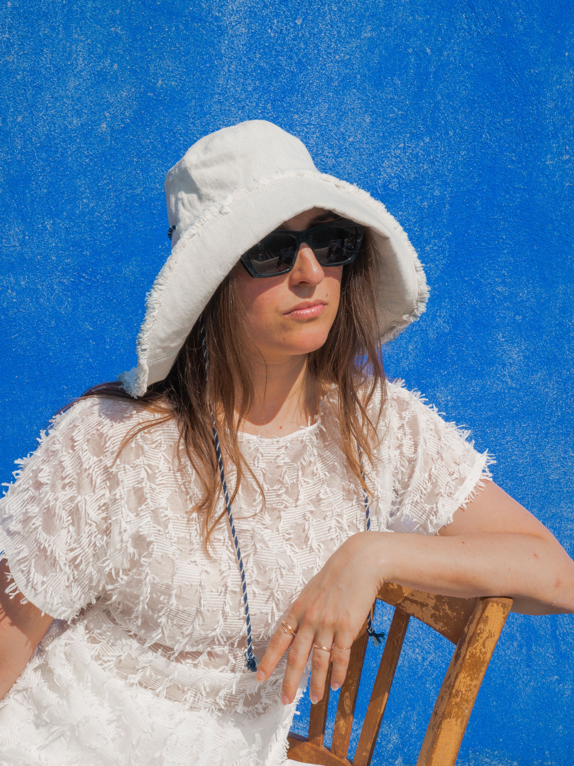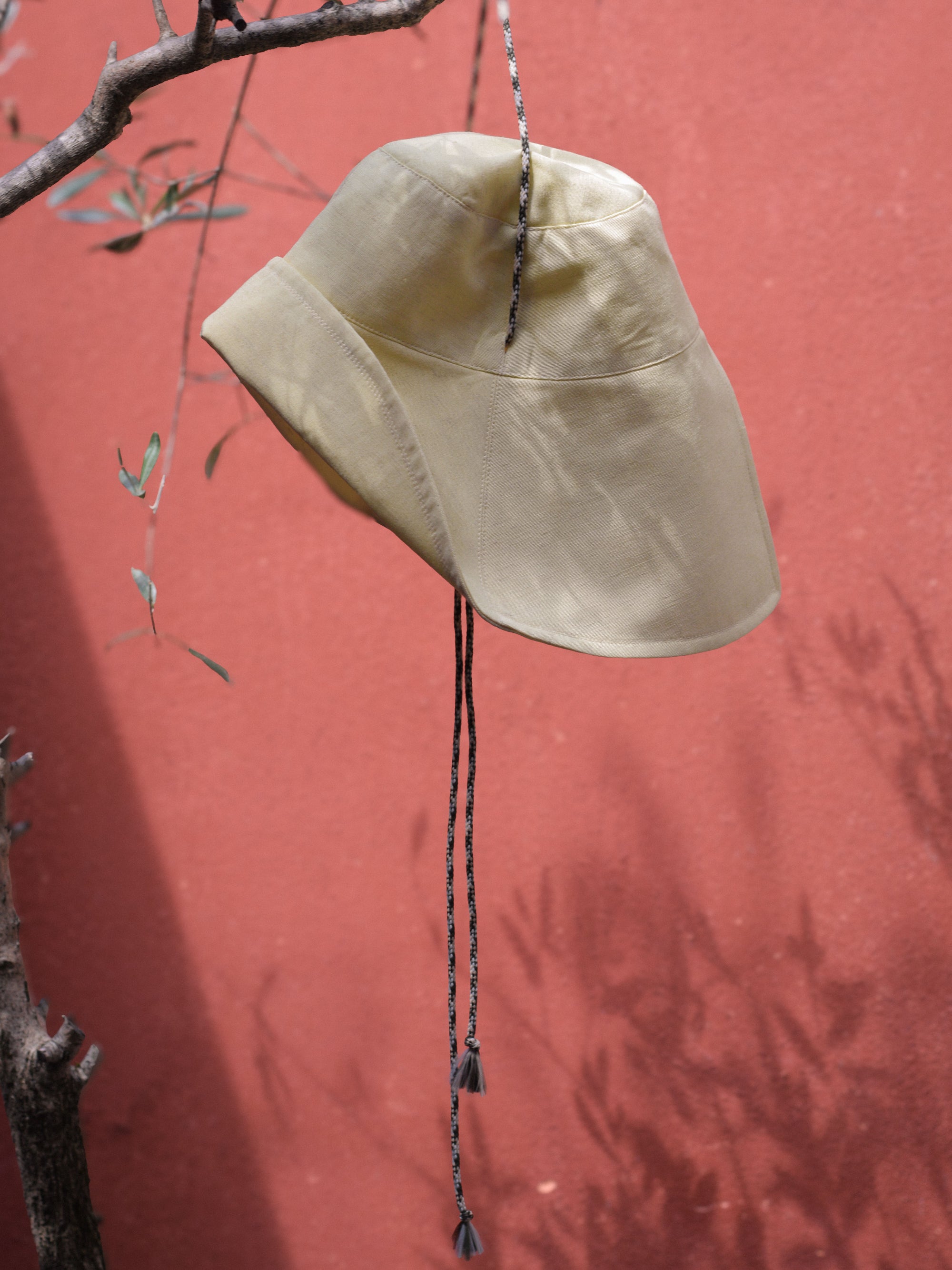 The Splice Hat is a wide-brimmed sun hat with modern lines designed for balmy days. Inspired by the classic fisherman hat, it features a cord threaded through the side seams, keeping the hat secure while adding a playful detail.